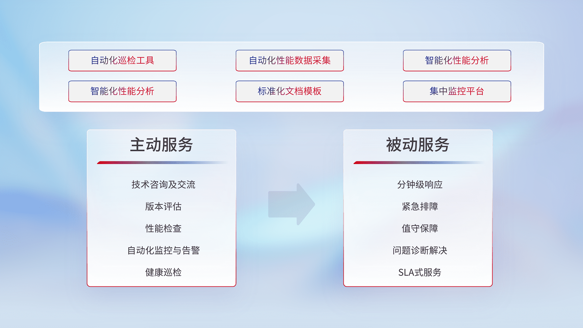 智能化工具和标准化文档,,保障服务质量,,,,提供主动服务(包含技术咨询、、、版本评估、、、、性能检查、、、自动化监控与告警、、健康巡检)和被动服务包含(分钟级响应、、、、紧急排障、、、、值守保障、、、、问题诊断解决、、SLA服务)。。。。