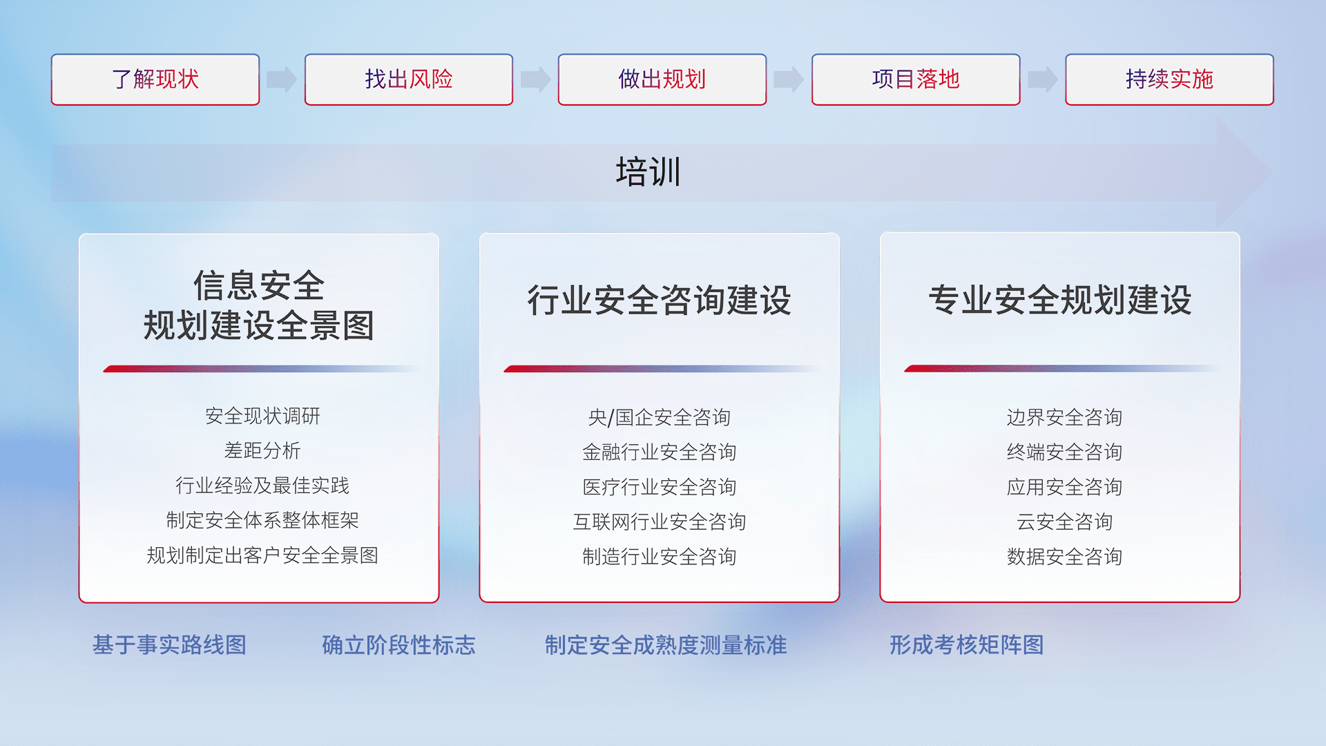 针对客户行业特性,,以专业的安全服务+多厂商联合解决方案提供专属的一站式安全管理服务,,,帮助客户全面感知网络空间威胁,,基于识别、、检测、、、、分析、、、防护、、、、监测、、响应的服务理论模型,,从方案咨询、、、集成交付、、评估验证、、、、优化加固、、运维运营,,致力于为客户提供完整的闭环管理式安全服务。。。以实战经验为客户打造高抵御风险的安全体系,,,帮助客户发现威胁、、、、对抗威胁、、、处置威胁,,,,不断积累安全对抗能力,,,,持续保障数字化安全。。。。
